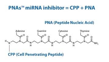 PANAGENE公司用PNA開發(fā)了比目前其他抑制劑特異性和穩(wěn)定性更好的抑制劑-PNAs™ miRNA 抑制劑。PNAs™ miRNA 抑制劑是單鏈的PNA,特異性的與內(nèi)源性miRNA結(jié)合有效的抑制其功能,研究miRNA的功能的很好工具。PNAs™ miRNA 抑制劑是與CPP (Cell Penetrating Peptide)結(jié)合的狀態(tài),沒有轉(zhuǎn)染試劑也能有效的進(jìn)入細(xì)胞。