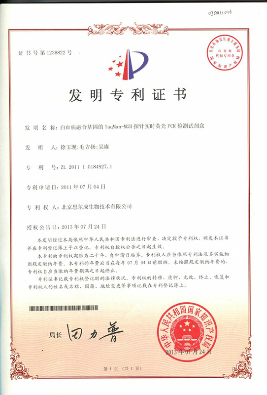 2011年申請了兩項(xiàng)發(fā)明專利,其中“常見八種白血病融合基因檢測試劑盒”已經(jīng)獲得發(fā)明專利證書授權(quán)(專利證書號第1238822號)。2013年申請北京市科委“北京市科技型中小企業(yè)創(chuàng)新基金”,項(xiàng)目通過資助審批。